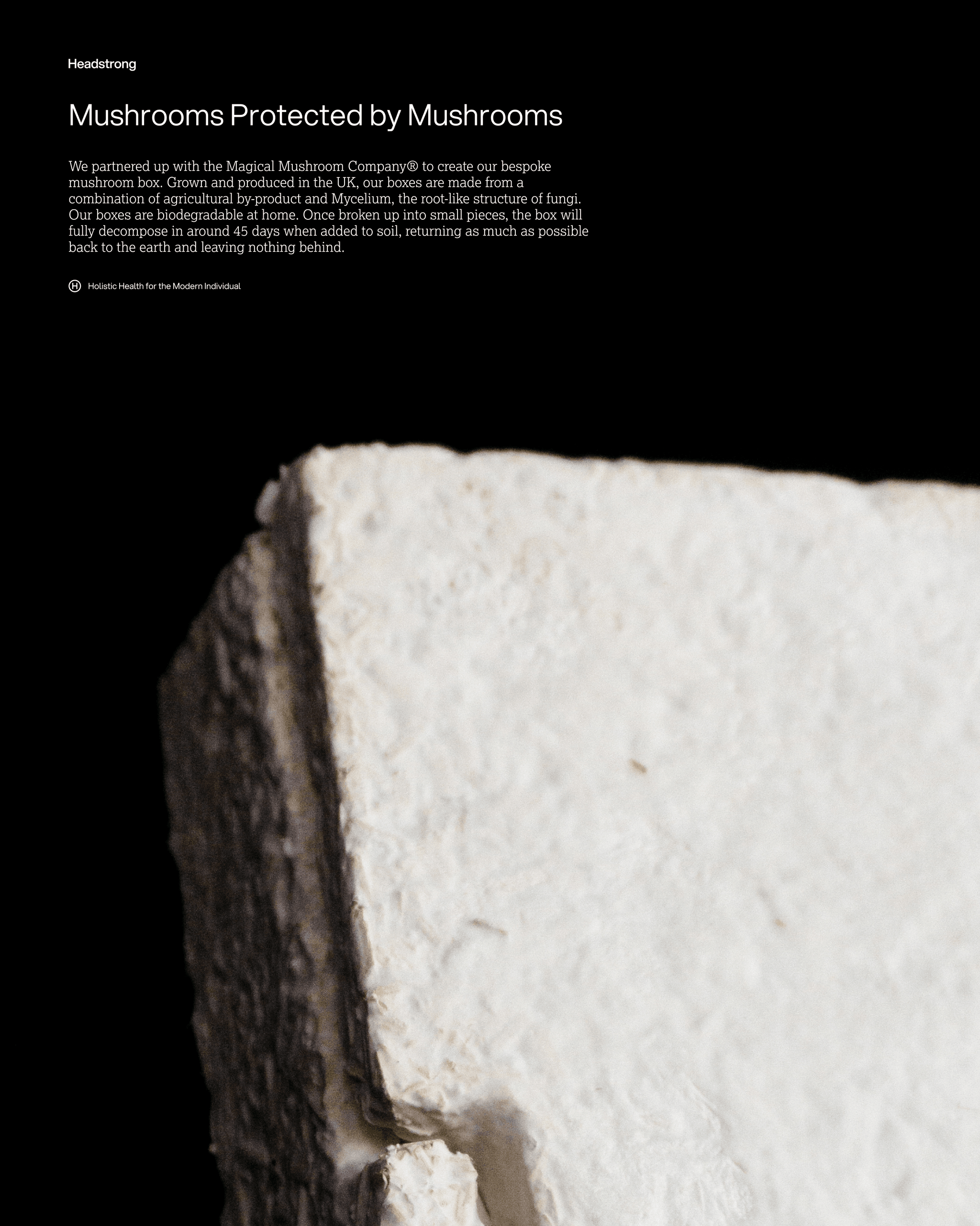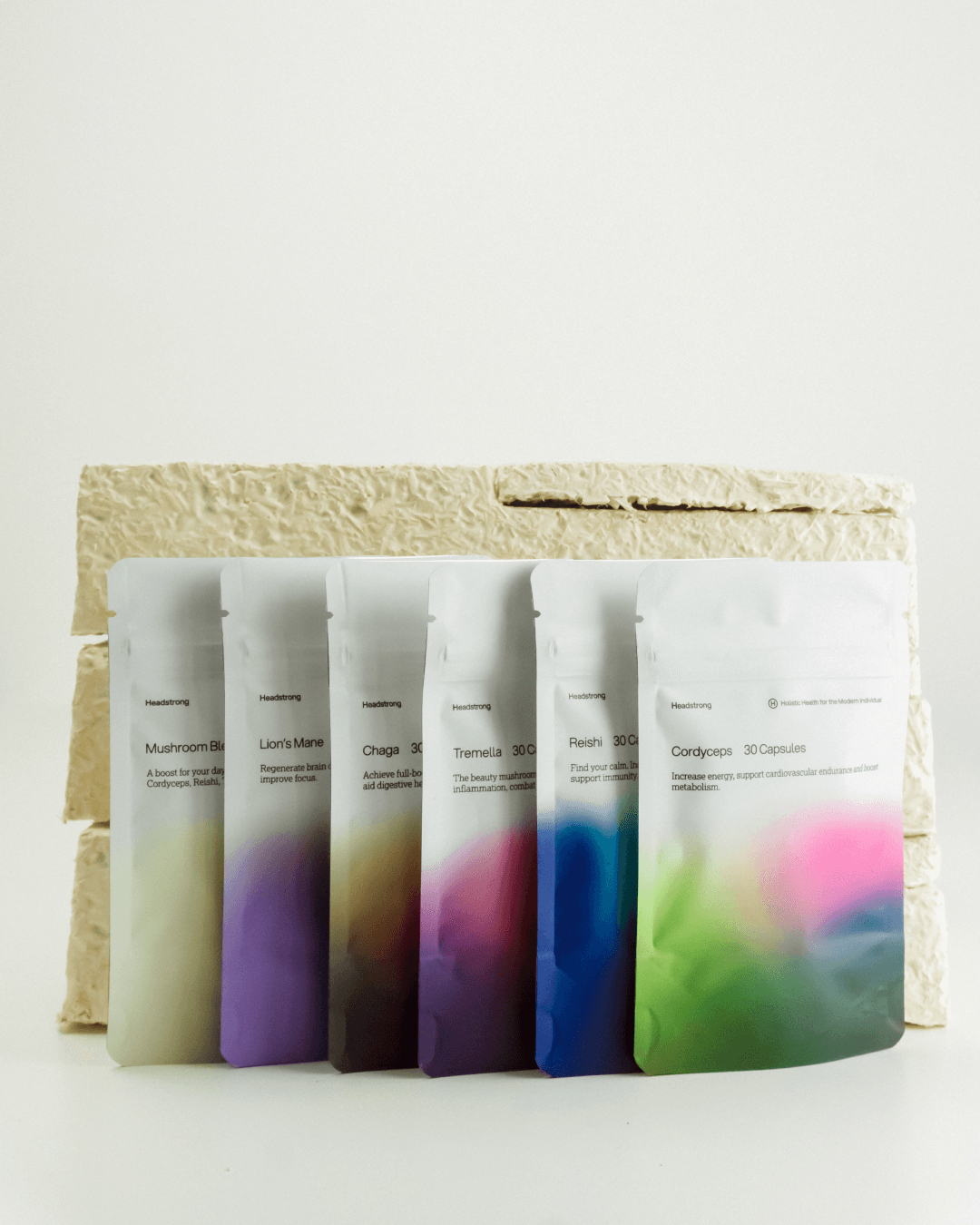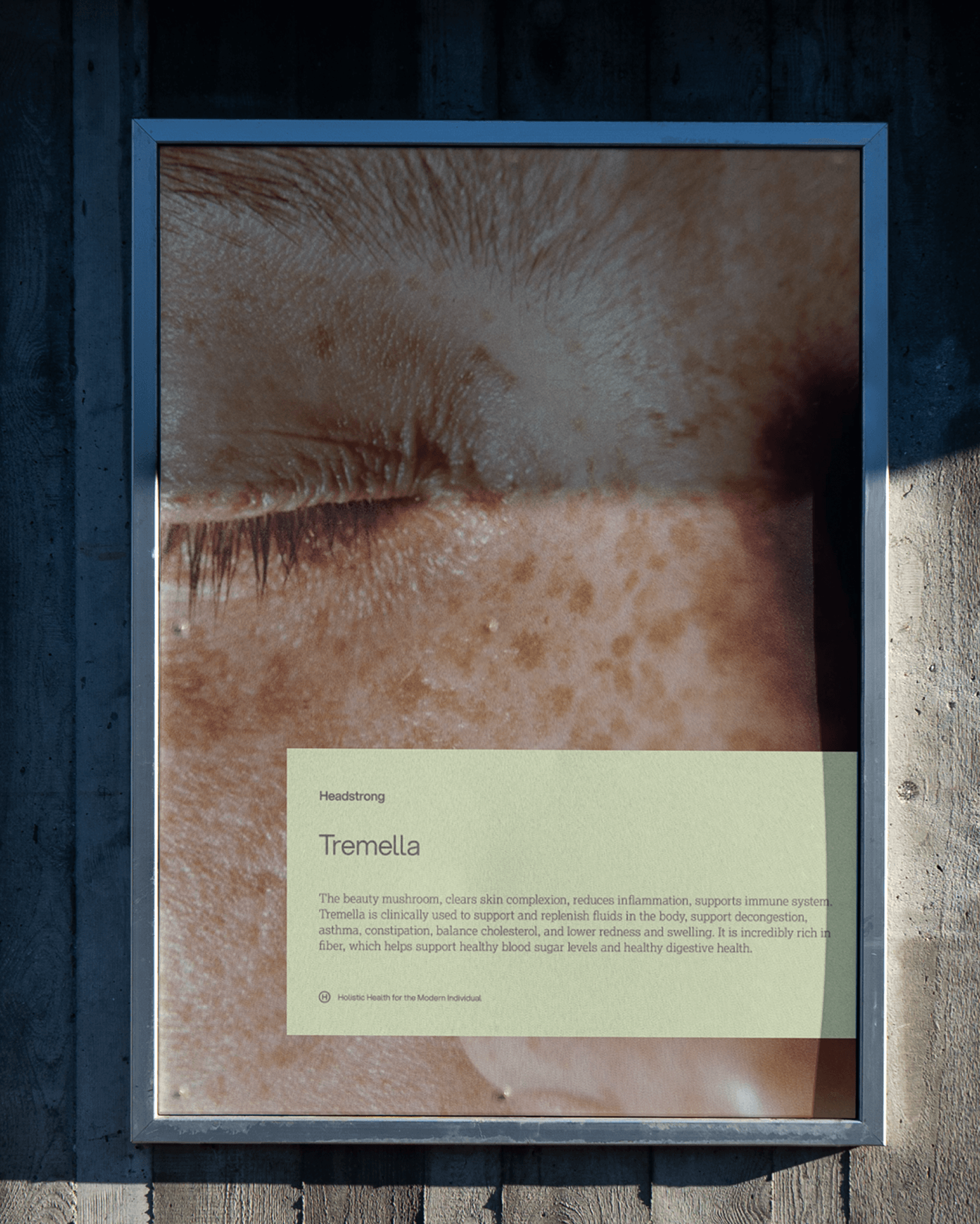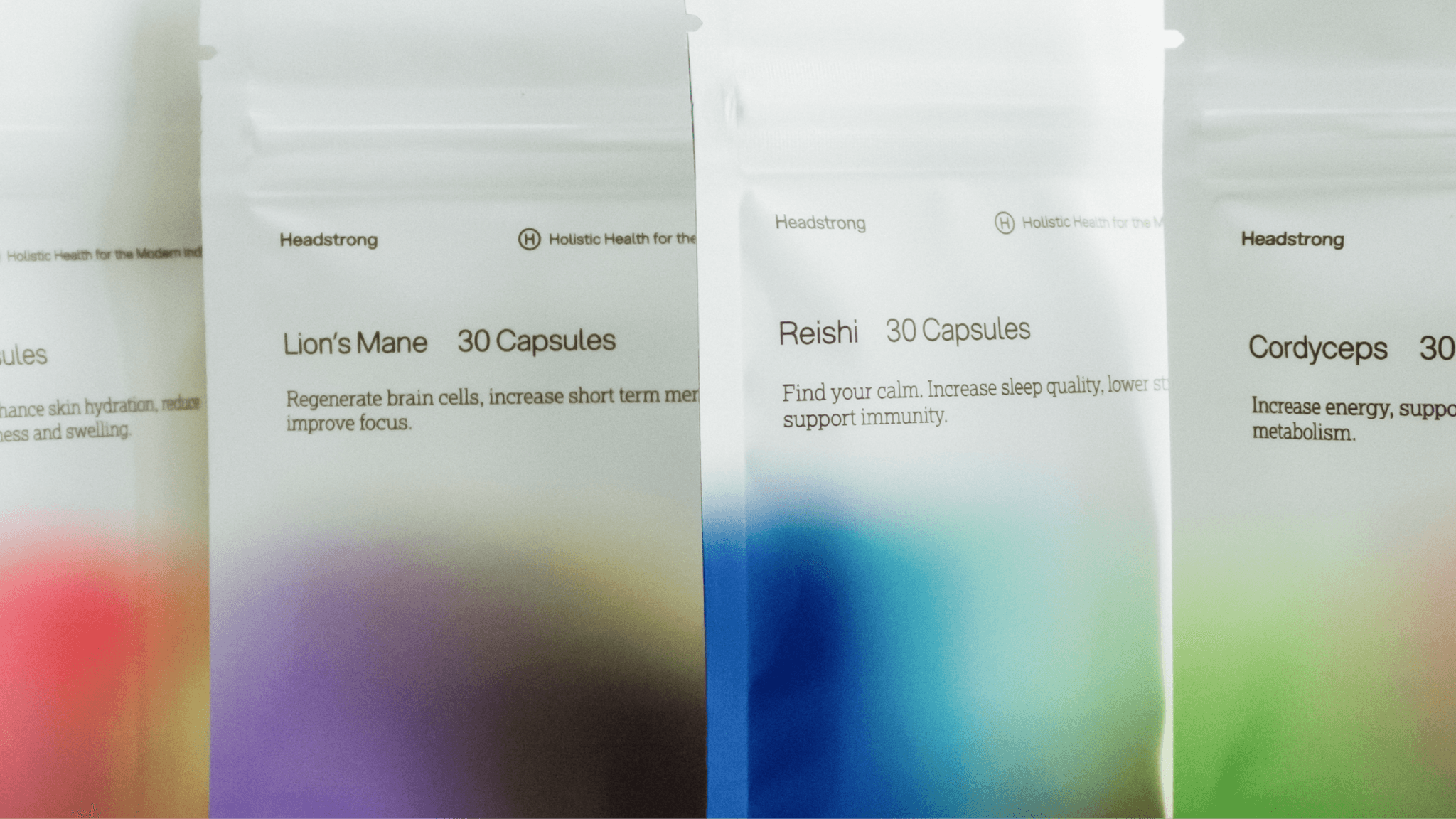 Founded by Finn Hall, Headstrong brings functional mushroom supplements to the forefront of wellbeing. Our partnership began by building the brand from the ground up, infusing meaning into every element: packaging inspired by each mushroom's unique characteristics, and a cohesive print and digital experience that works both individually and as a family.