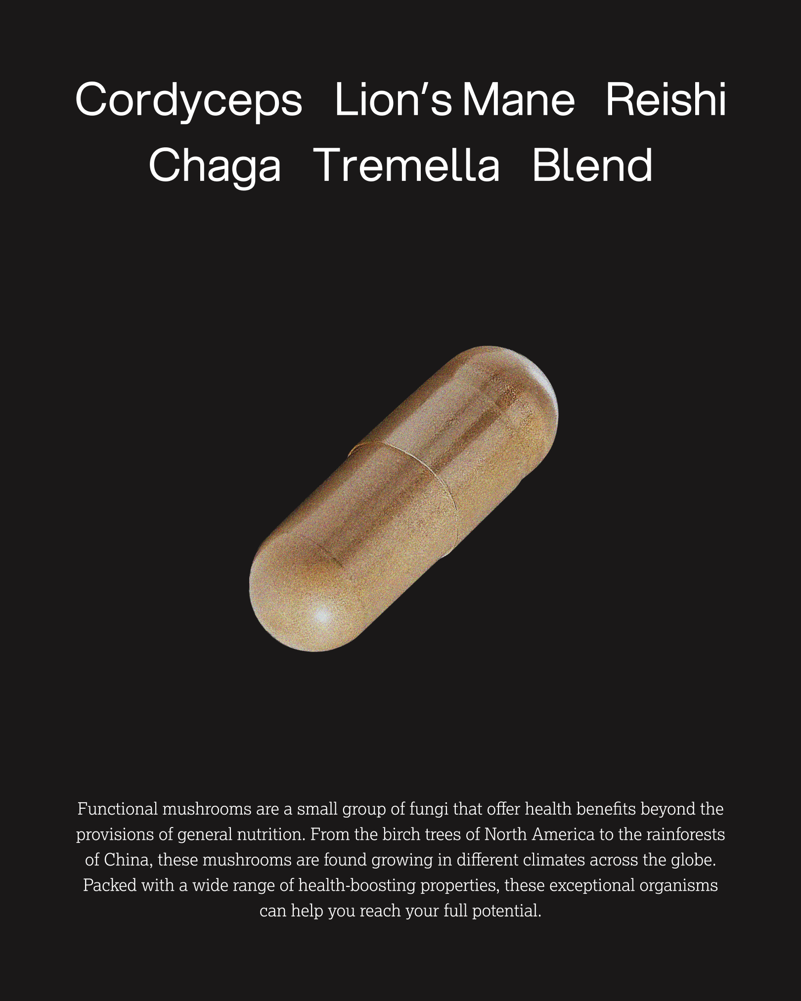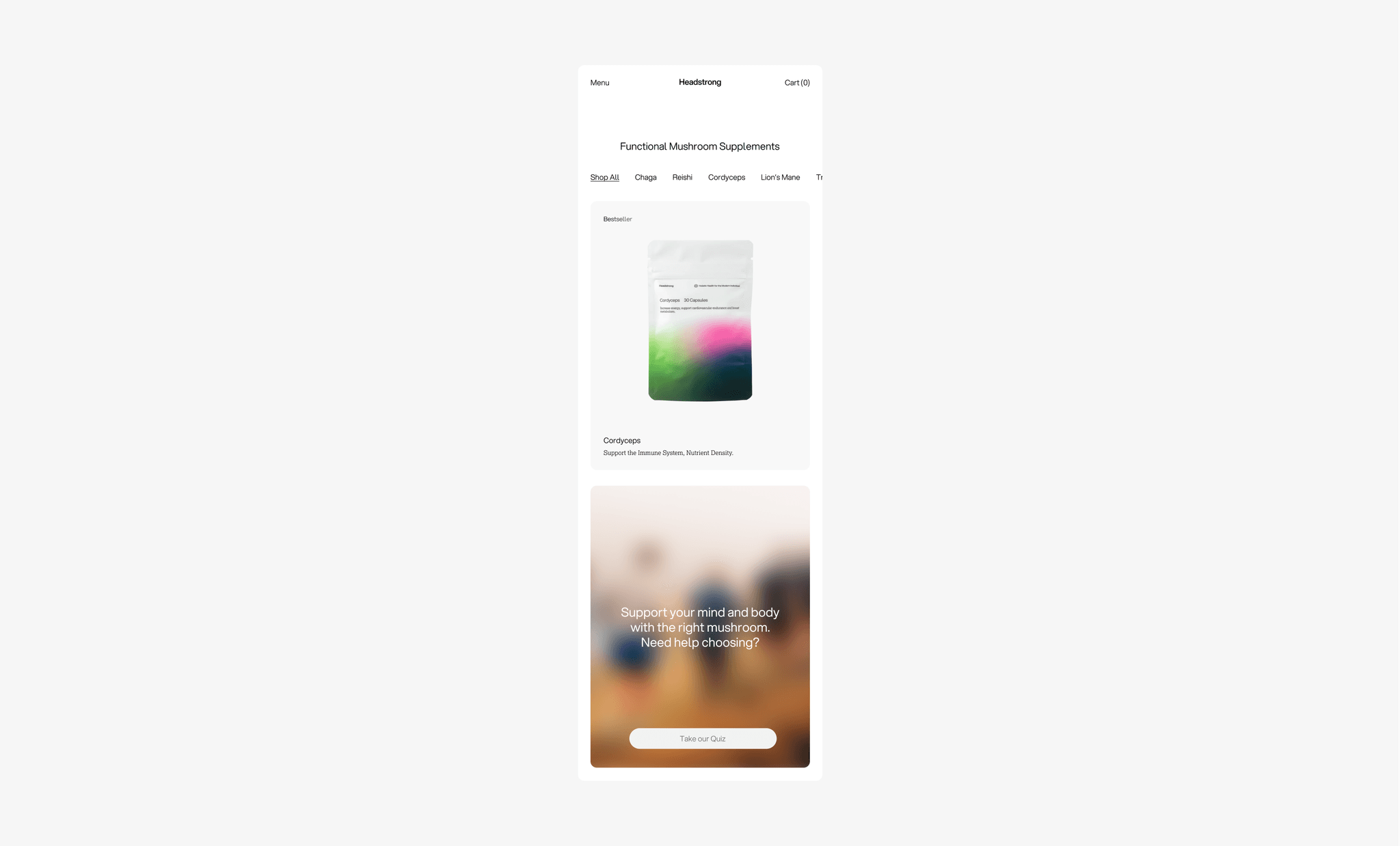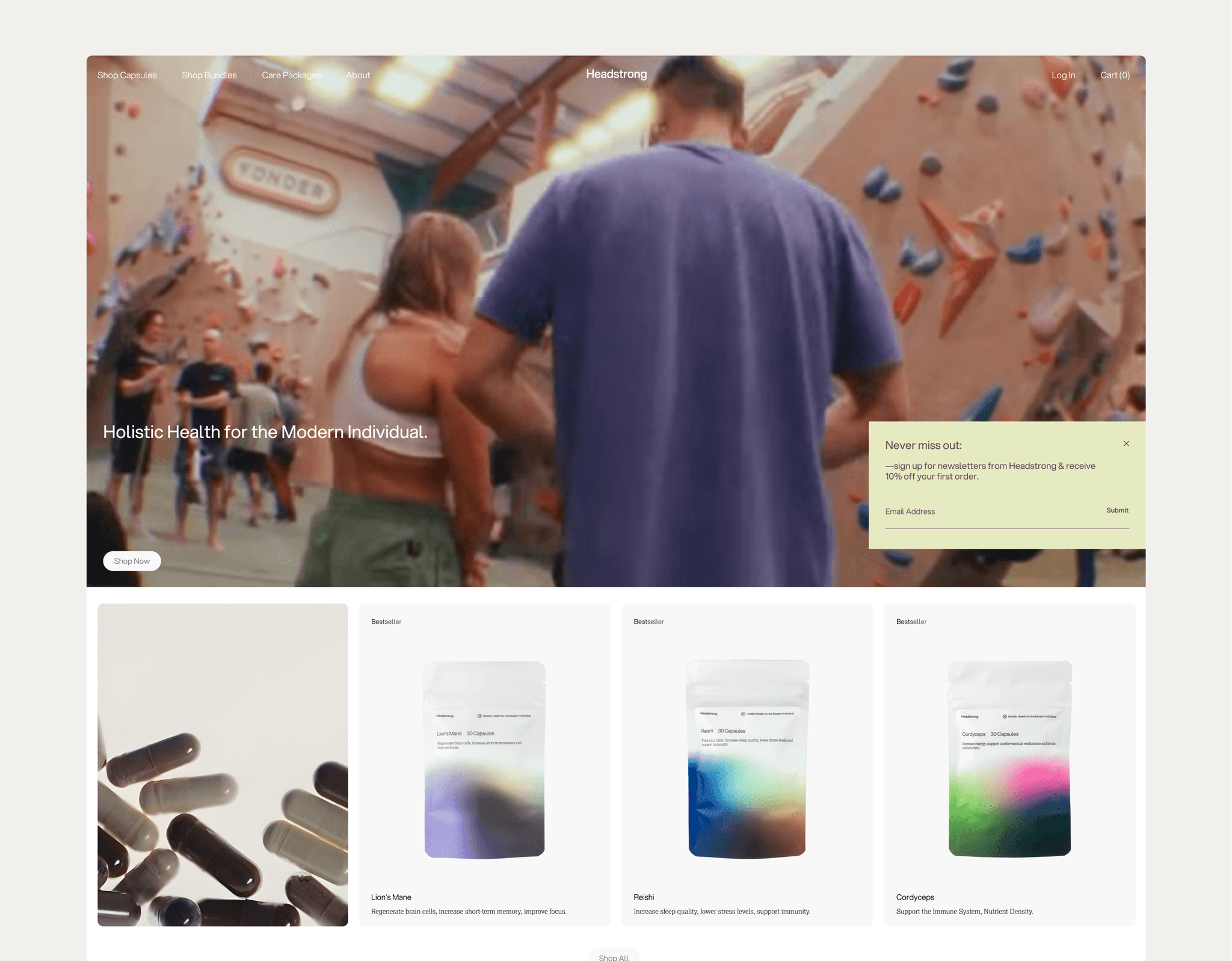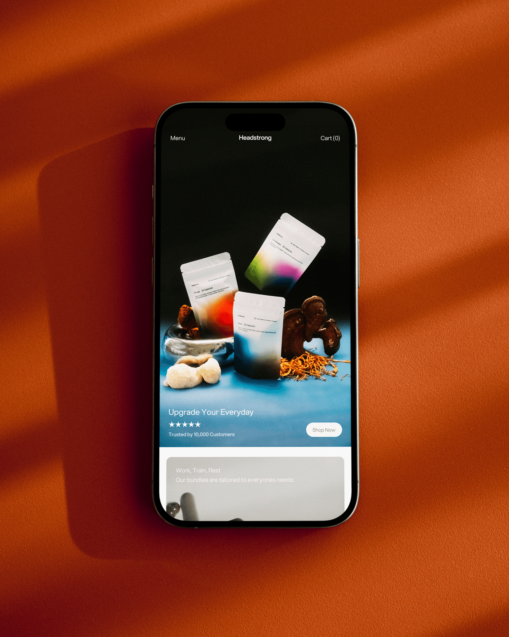 Founded by Finn Hall, Headstrong brings functional mushroom supplements to the forefront of wellbeing. Our partnership began by building the brand from the ground up, infusing meaning into every element: packaging inspired by each mushroom's unique characteristics, and a cohesive print and digital experience that works both individually and as a family.